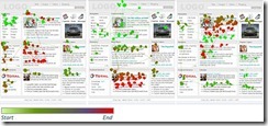 再来看看眼动结果(由上至下依次为中、美、韩)。绿色的点代表眼睛活动的开始,红色代表结束。
